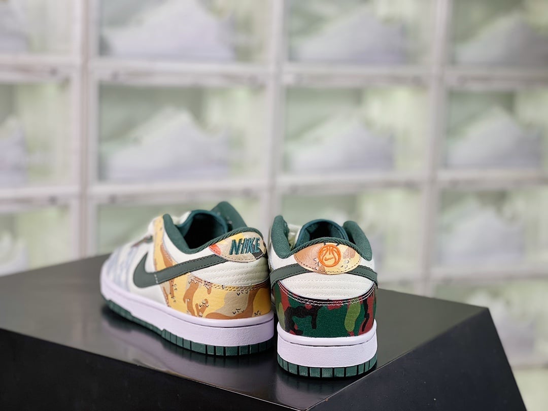 O NK Dunk Low Camuflagem Assimétrica apresenta couro premium com padrão camuflado assimétrico, oferecendo conforto clássico e estilo urbano moderno.