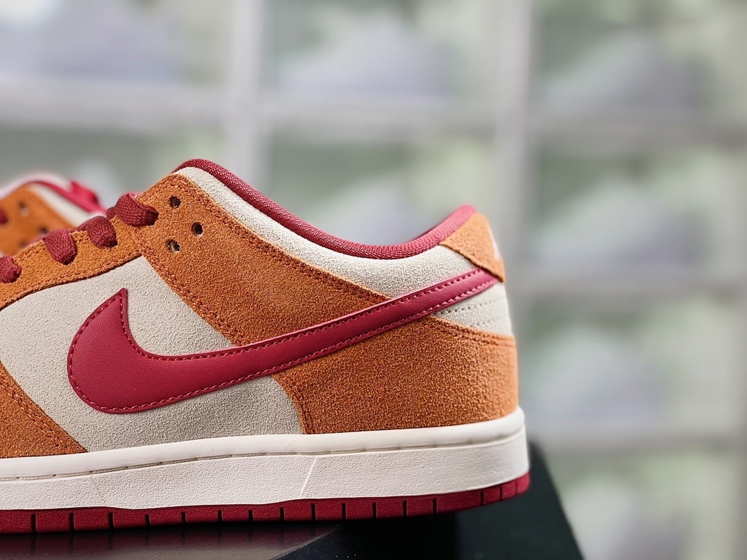O NK Dunk Low Dark Brown e Brick Red apresenta couro premium com combinação de castanho escuro e vermelho tijolo, oferecendo conforto clássico e estilo urbano moderno.