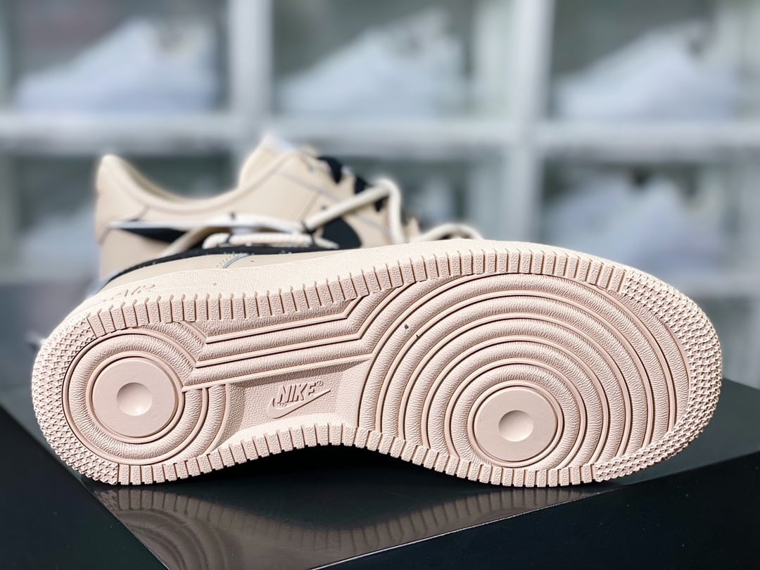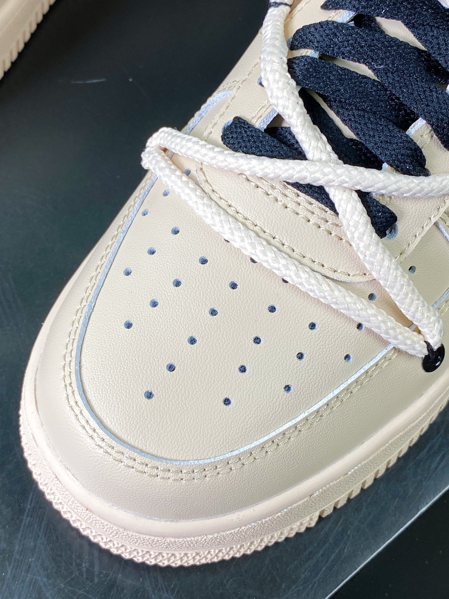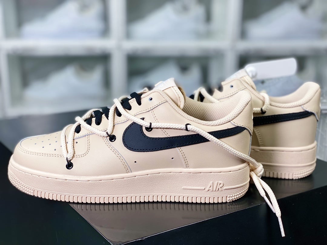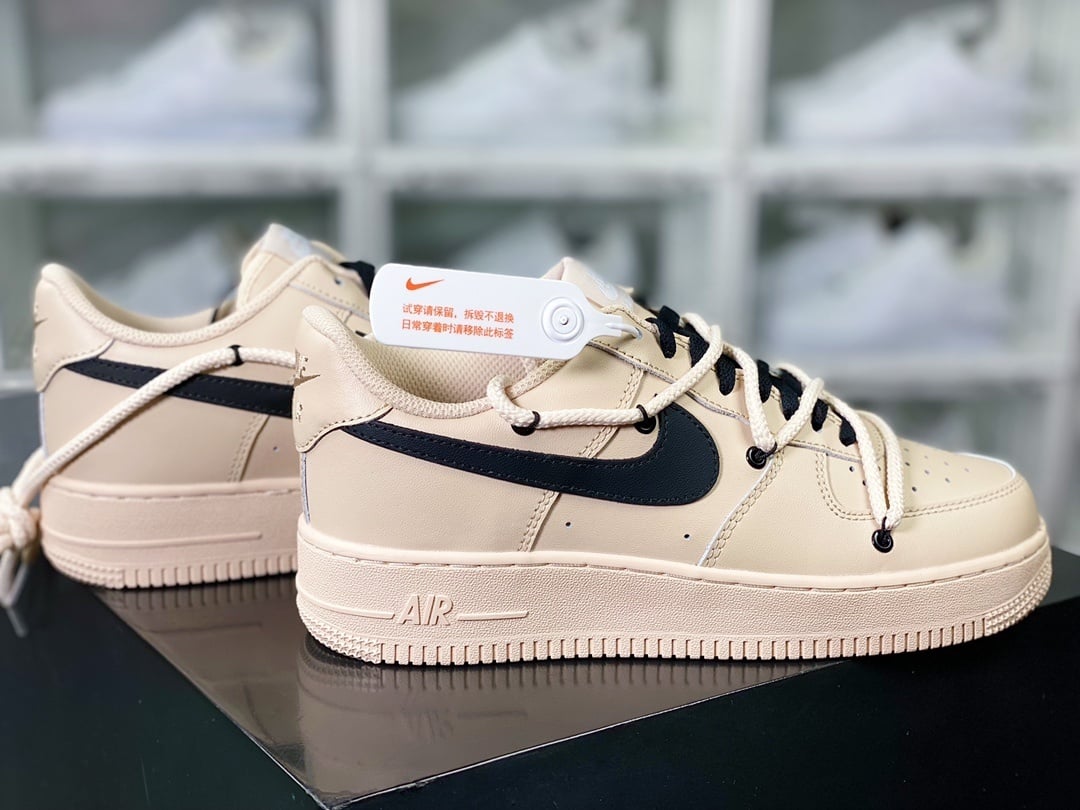 Os Nike Caramel Amarelo e Preto Cordões apresentam couro premium em tons de creme e caramelo com cordões pretos, combinando conforto clássico com estilo urbano moderno.